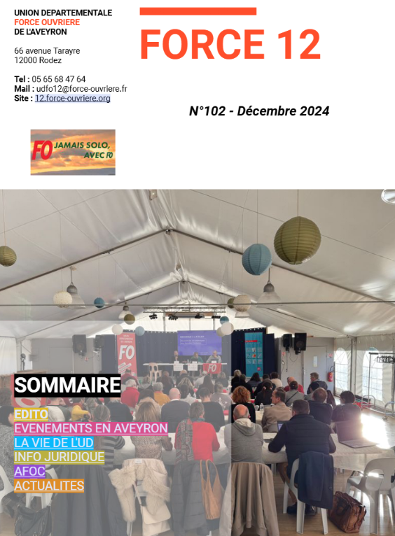 FORCE 12 Journal FO n°102 décembre 2024 lundi 23 décembre 2024, par UDFO12 Voir en ligne : FORCE 12 n°102 Décembre 2024